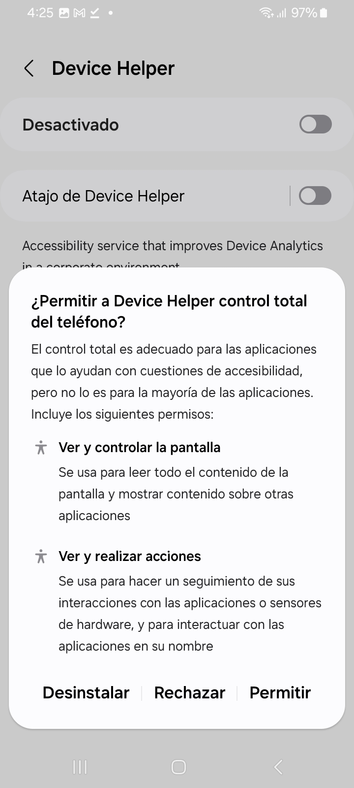 Después de activar Device Helper, se le mostrará un diálogo preguntándole si desea permitir que la aplicación vea, controle la pantalla y realice acciones. Debe presionar el botón Permitir para continuar.